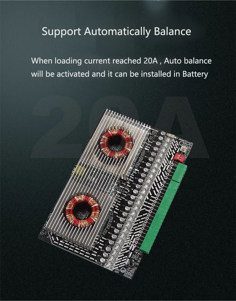 This Active Balancer will charge the cell with lower voltage from higher voltage groups . the balance current can reach 5A to 8A . it using high-frequency transformer inverter and equipotential isolation coupling energy method, the originally series connected battery packs are connected in parallel through equipotential coupling to achieve energy balance distribution for each series of batteries. Based on parallel connection, the uneven high and low voltages of each series are achieved. The actual balance work is controlled by the main control MCU, and the balance effect can reach within 30mV